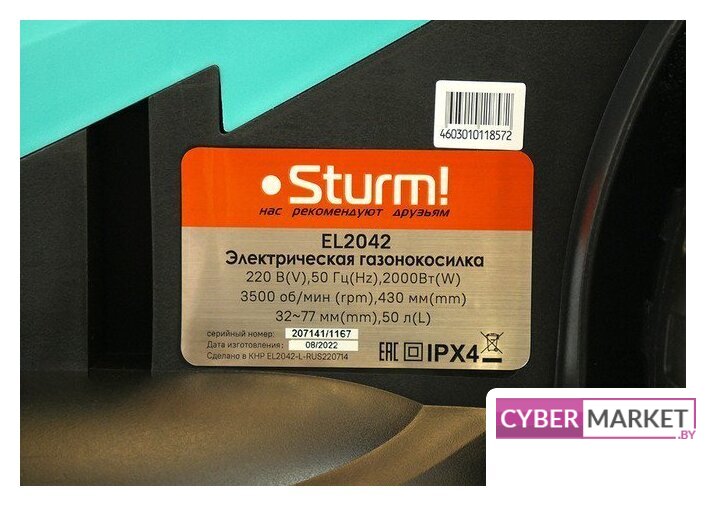 | Комплектация | - газонокосилка,, - рукоятка (верхняя и нижняя части),, - барашки крепления рукояток,, - травосборник,, - болты (2 шт),, - шайбы (2 шт),, - фиксатор кабеля (2 шт),, - инструкция по эксплуатации,, - инструкция по безопасности |