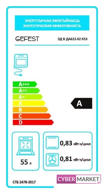 электрический с конвекцией, объем 65 л, 8 режимов, очистка ручная, проволочные направляющие, телескопические направляющие, энергопотребление A