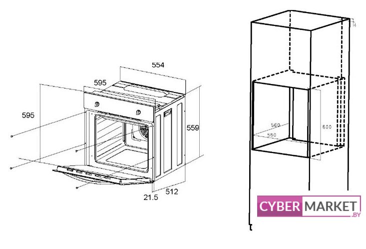 электрический с конвекцией, объем 60 л, утапливаемые переключатели, 6 режимов, очистка паровая, направляющие проволочные