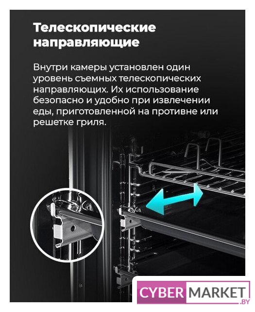 электрический с конвекцией, объем 71 л, утапливаемые переключатели, 9 режимов, очистка ручная, 2 стекла в дверце, направляющие проволочные + телескопические