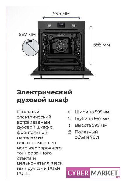 электрический с конвекцией, объем 71 л, утапливаемые переключатели, 9 режимов, очистка ручная, 2 стекла в дверце, направляющие проволочные + телескопические