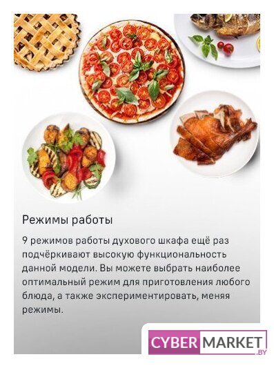 | Режимы работы | нижний нагрев, двухсторонний нагрев, большой гриль, вентиляционный нагрев, гриль + конвекция, двухсторонний нагрев + конвекция, размораживание |
