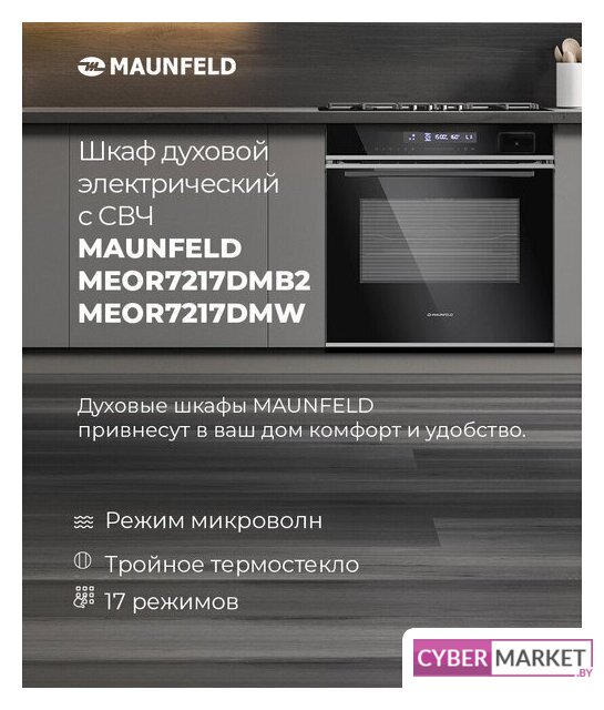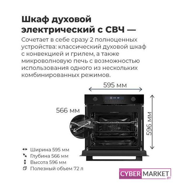 электрический с конвекцией, микроволны, объем 72 л, 14 режимов, автопрограммы, очистка ручная, 3 стекла в дверце, направляющие проволочные