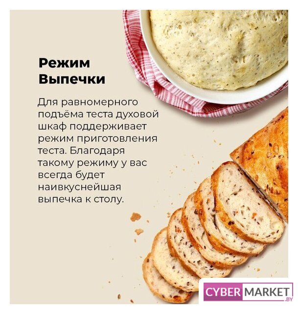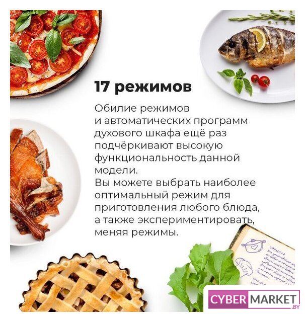 | Режимы работы | нижний нагрев, двухсторонний нагрев, большой гриль, гриль + конвекция, нижний нагрев + конвекция, двухсторонний нагрев + конвекция, размораживание, предварительный разогрев духовки, подготовка теста |