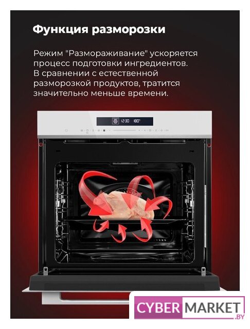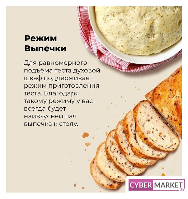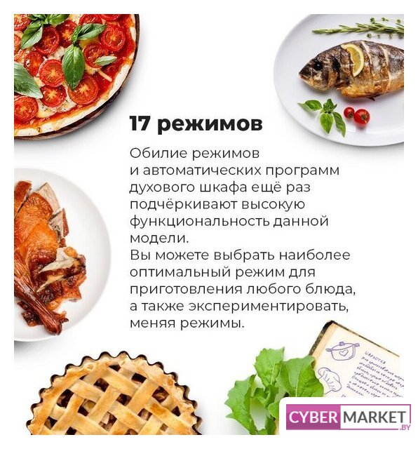 | Режимы работы | нижний нагрев, двухсторонний нагрев, большой гриль, гриль + конвекция, нижний нагрев + конвекция, двухсторонний нагрев + конвекция, размораживание, предварительный разогрев духовки, подготовка теста |
