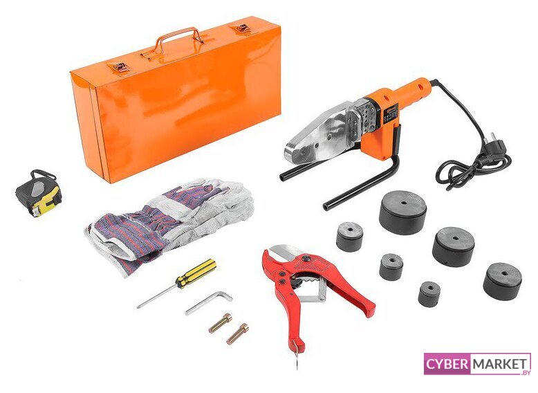 | Комплектация | 6 насадок для сварки труб (Ø 20, 25, 32, 40, 50, 63 мм);шестигранный ключ;отвертка;труборез;перчатки;рулетка (3 м);кейс. |