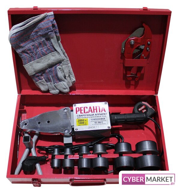 1500 Вт, мечевидный, 300 °C, термостат, нагрев 15 минут, с тефлоновым покрытием, насадки 20 мм/25 мм/32 мм/40 мм/50 мм/63 мм, труборез, кейс