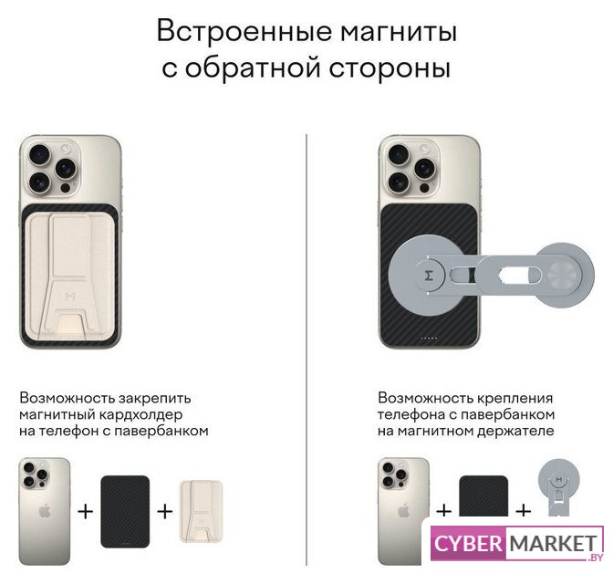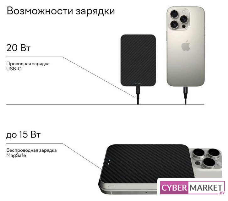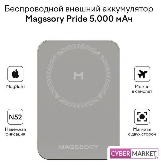 10000 мА·ч (36 Вт·ч), выходы: 2 x 5V/10V/12V/15V (3000 мА), быстрая зарядка, беспроводная зарядка, поддержка MagSafe, крепление на смартфон