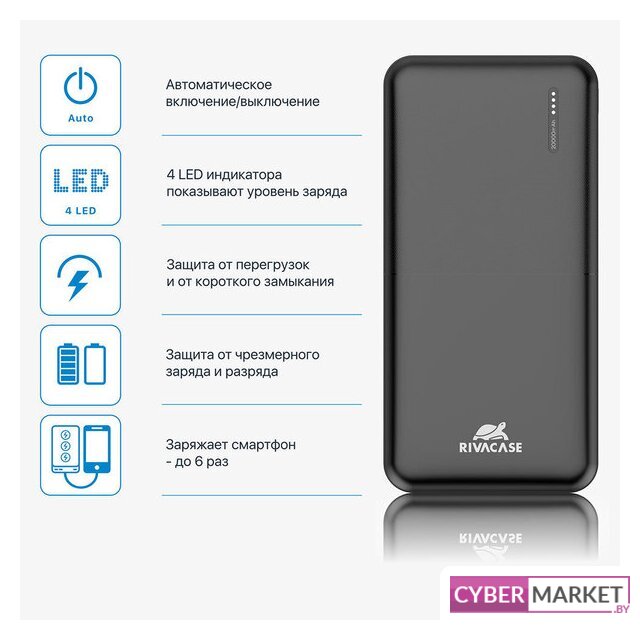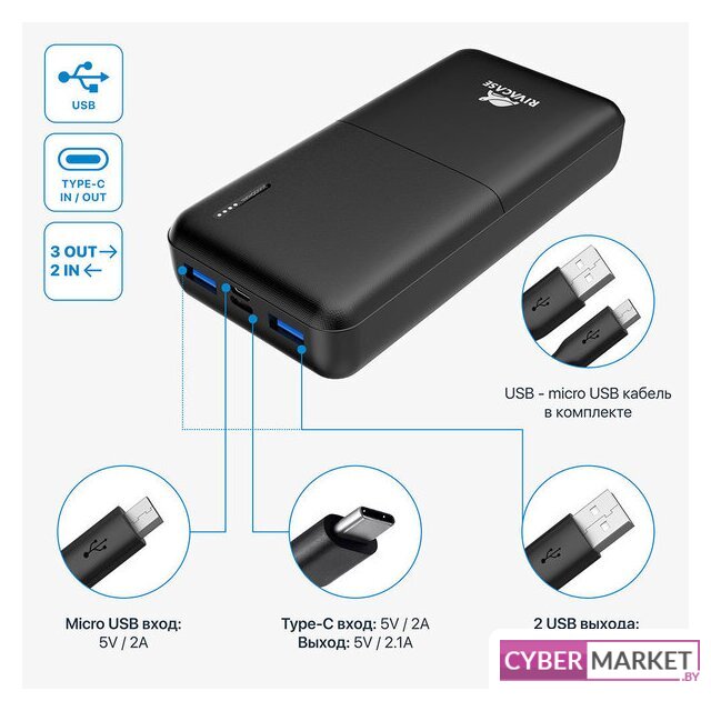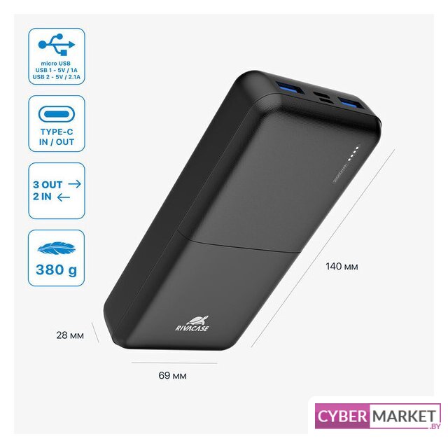 10000 мАч (37 Вт·ч), выходы: 3 x 5V (2000 мА)