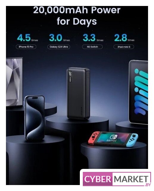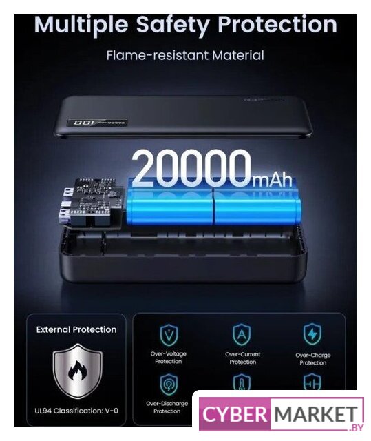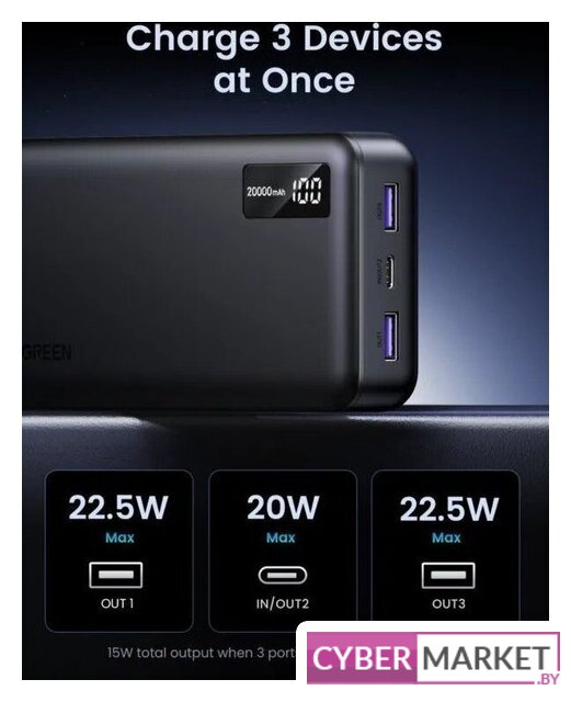 20000 мА·ч (74 Вт·ч), выходы: 3 x 5V/9V/10V/12V/15V/20V (3000 мА), быстрая зарядка