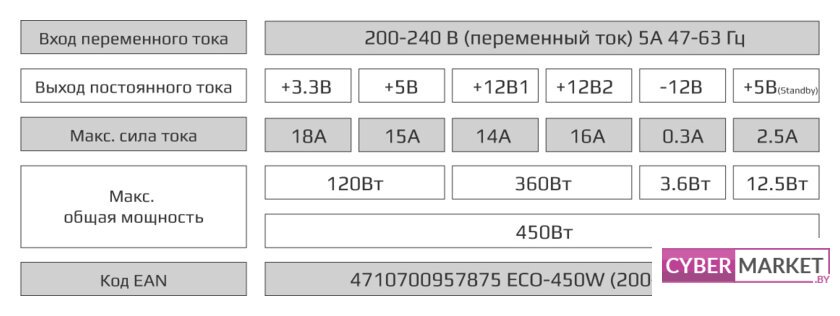 | Комбинированная нагрузка по +12V | 360 Вт |