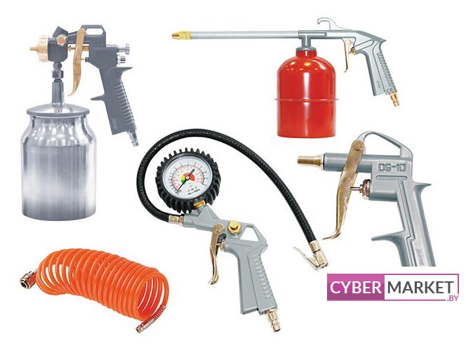 | Комплектация | Краскораспылитель с нижним бачком и соплом 1,5 мм - 1 шт.Дополнительное сопло 2,0 мм - 1 шт.Пневмопистолет для вязких жидкостей - 1 шт.Пневмопистолет для продувки - 1 шт.Пневмопистолет для накачки шин с манометром - шт.Спиральный шланг - 1 шт.Упаковка |