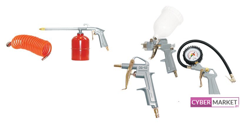 | Комплектация | краскораспылитель с верхним бачком объемом 0,6 лпневмопистолет для вязких жидкостей с бачком 0,85 лпневмопистолет для продувкипневмопистолет для накачки шин с манометормспиральный шланг 5м |