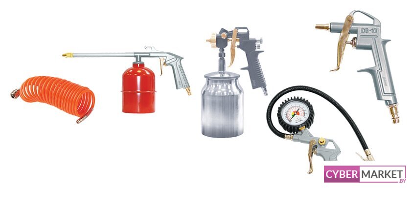 | Комплектация | краскораспылитель с нижним бачком объемом 1,0 л.пневмопистолет для вязких жидкостей с бачком 0,85 л.пневмопистолет для продувкипневмопистолет для накачки шин с манометромспиральный шланг длиной 5 м |