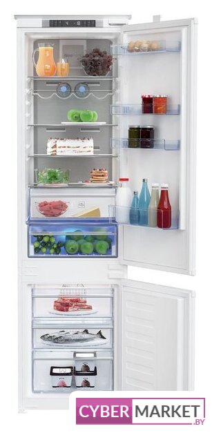 встраиваемый, No Frost (морозильная камера), электронное управление, класс A+, полезный объём: 281 л (225 + 56 л), перенавешиваемые двери, полка для вина, лоток для яиц, 54x54x193.7 см, белый