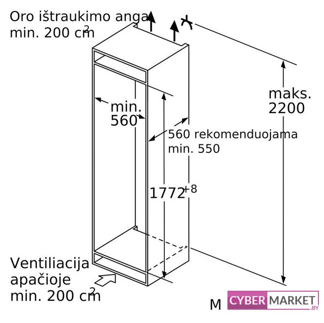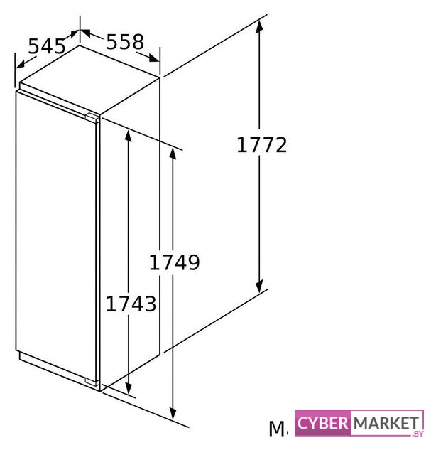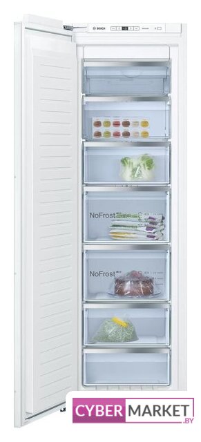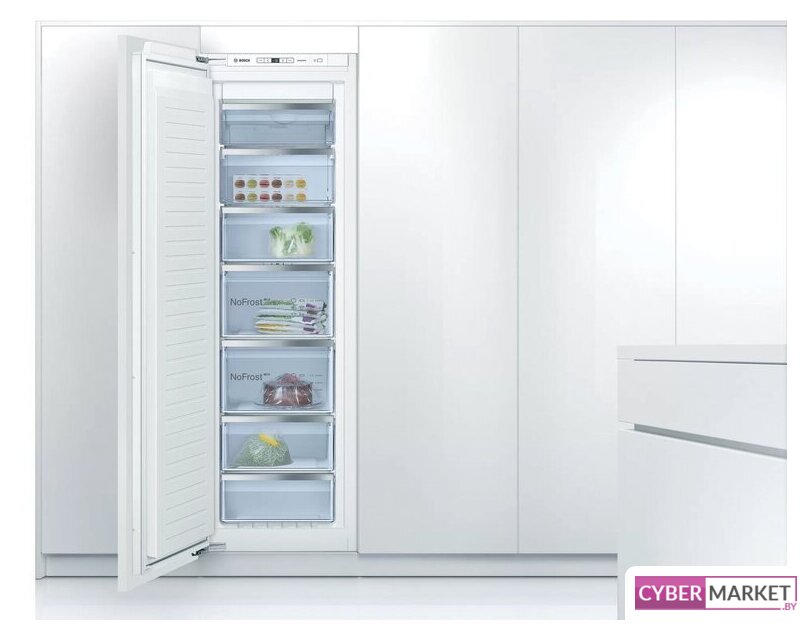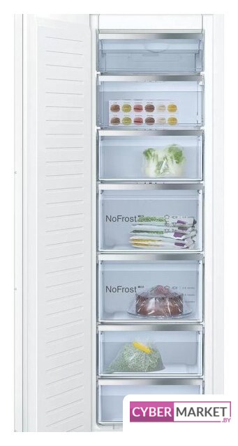 встраиваемый, скользящие направляющие, полный No Frost, электронное управление, полезный объём: 280 л (212 + 68 л), зона свежести, перенавешиваемые двери, складная полка, подставка-лоток для бутылок, лоток для яиц, 54x54.5x193.5 см, белый