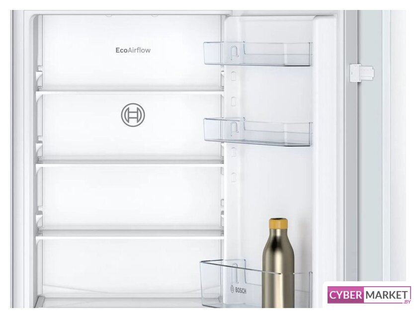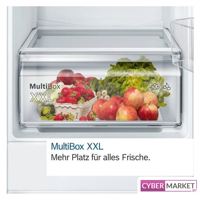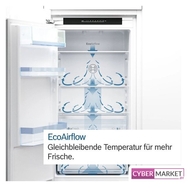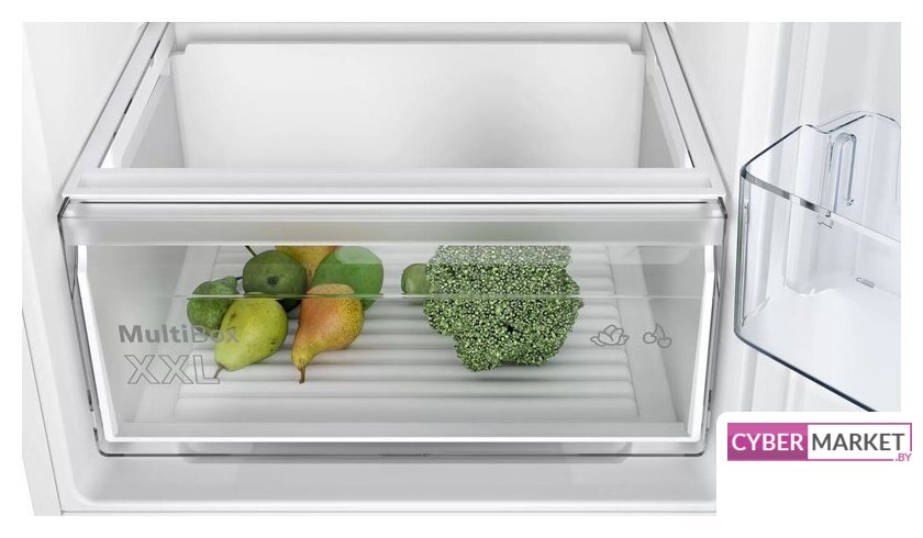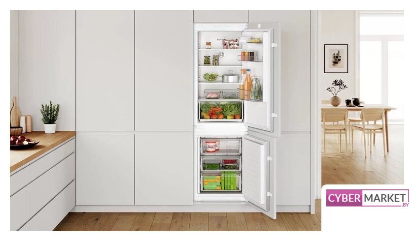 встраиваемый, скользящие направляющие, полный No Frost, электронное управление, полезный объём: 267 л (193 + 74 л), инверторный компрессор, зона свежести, перенавешиваемые двери, полка для вина, лоток для яиц, 54x55x177.5 см, белый