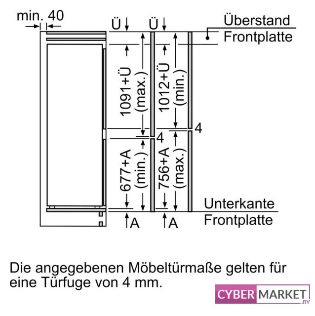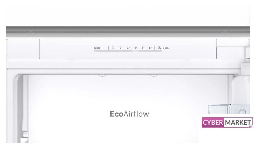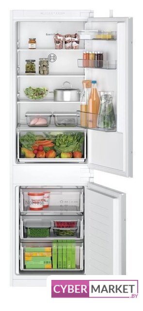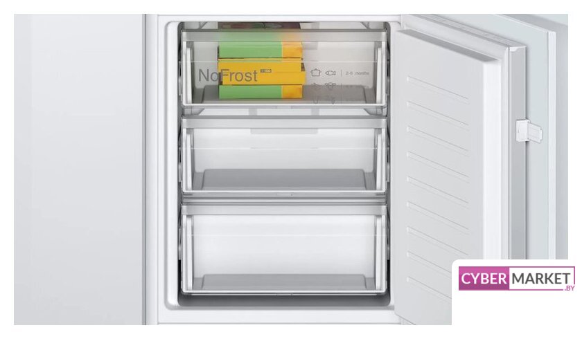 встраиваемый, скользящие направляющие, полный No Frost, электронное управление, полезный объём: 267 л (193 + 74 л), зона свежести, перенавешиваемые двери, 54x55x177.5 см, белый