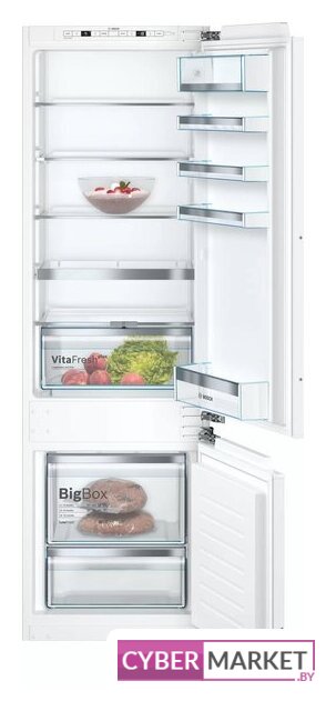 встраиваемый, жесткое, No Frost (морозильная камера), сенсорное управление, полезный объём: 285 л (215 + 70 л), перенавешиваемые двери, полка для вина, лоток для яиц, 55.9x54.6x193.8 см, белый