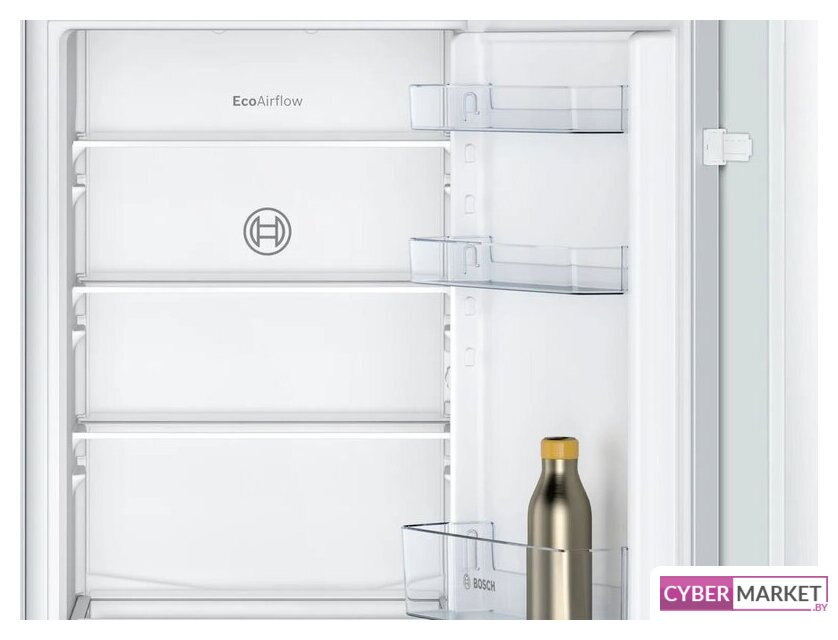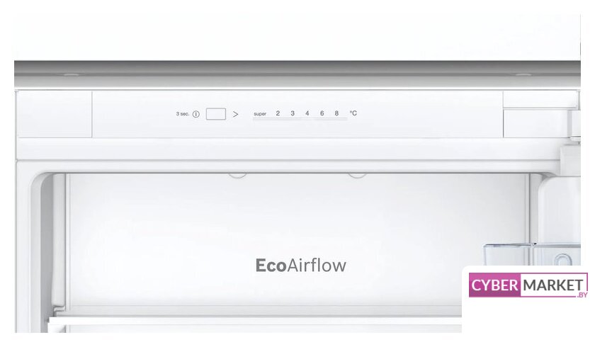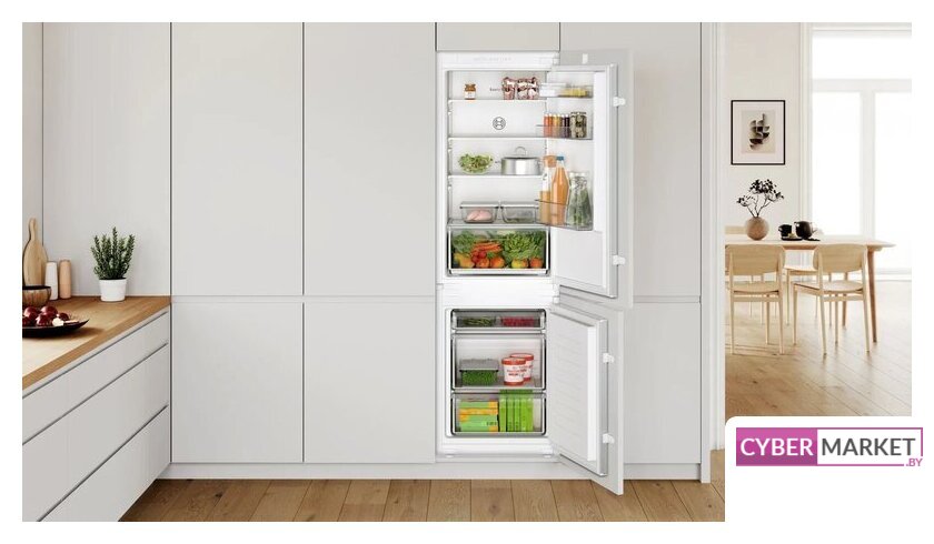 встраиваемый, без No Frost, электронное управление, класс A+, полезный объём: 270 л (195 + 75 л), инверторный компрессор, перенавешиваемые двери, лоток для яиц, 54x54.5x177.5 см, белый