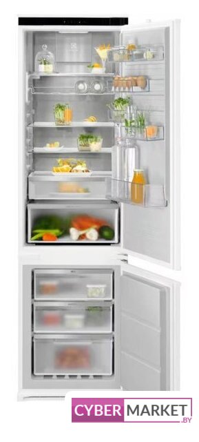 встраиваемый, скользящие направляющие, полный No Frost, электронное управление, полезный объём: 267 л (193 + 74 л), инверторный компрессор, перенавешиваемые двери, выдвижная полка, лоток для яиц, 54x55x177.5 см, белый