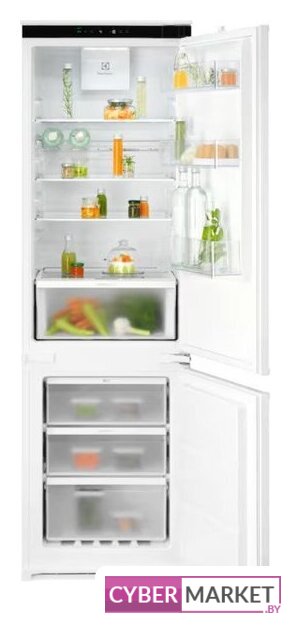 встраиваемый, без No Frost, электронное управление, полезный объём: 267 л (183 + 84 л), перенавешиваемые двери, лоток для яиц, 54.1x54.8x177.2 см, белый