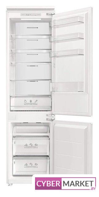 встраиваемый, полный No Frost, электронное управление, класс A, полезный объём: 284 л (215 + 69 л), инверторный компрессор, зона свежести, перенавешиваемые двери, полка для вина, лоток для яиц, 54x54.5x193.5 см, белый