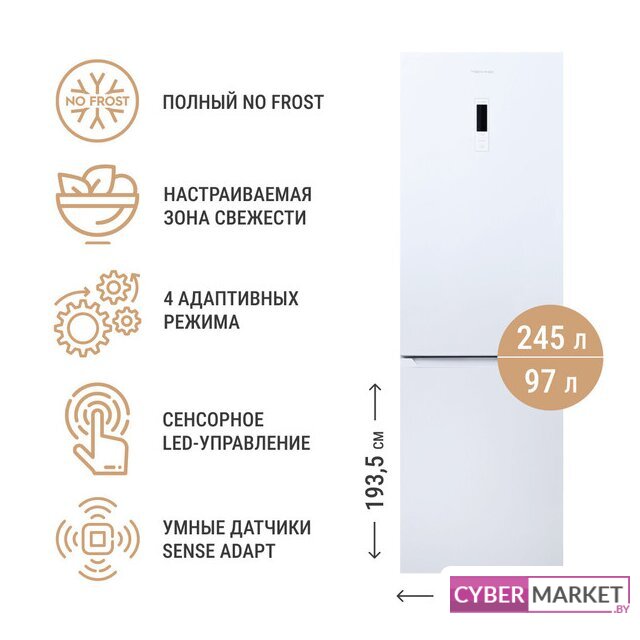 отдельностоящий, полный No Frost, электронное управление, класс A+, полезный объём: 365 л (277 + 88 л), инверторный компрессор, перенавешиваемые двери, лоток для яиц, 59.5x68.2x203 см, белый