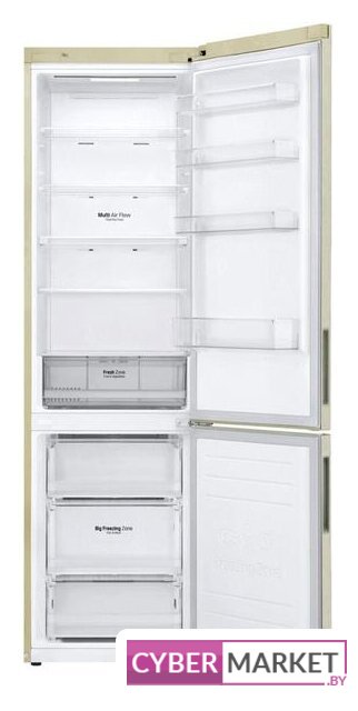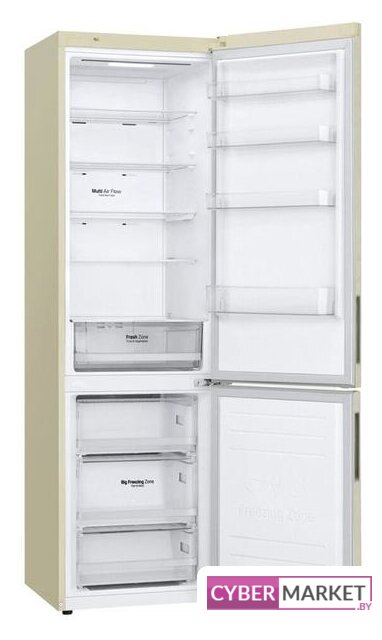 отдельностоящий, полный No Frost, электронное управление, класс A+, полезный объём: 384 л (277 + 107 л), инверторный компрессор, перенавешиваемые двери, лоток для яиц, 59.5x68.2x203 см, бежевый
