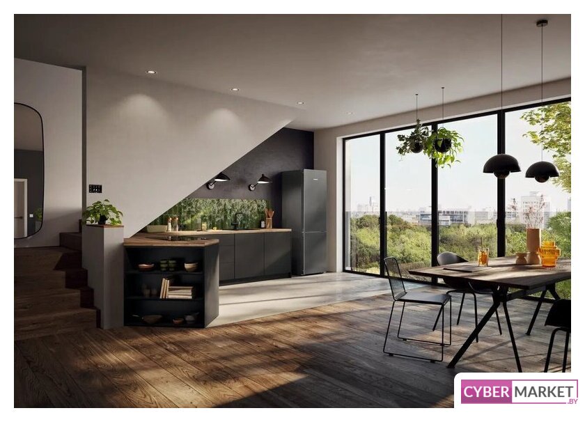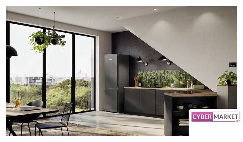 отдельностоящий, No Frost (морозильная камера), сенсорное управление, полезный объём: 361 л (258 + 103 л), зона свежести, перенавешиваемые двери, складная полка, лоток для яиц, 59.7x67.5x201.5 см, темная сталь