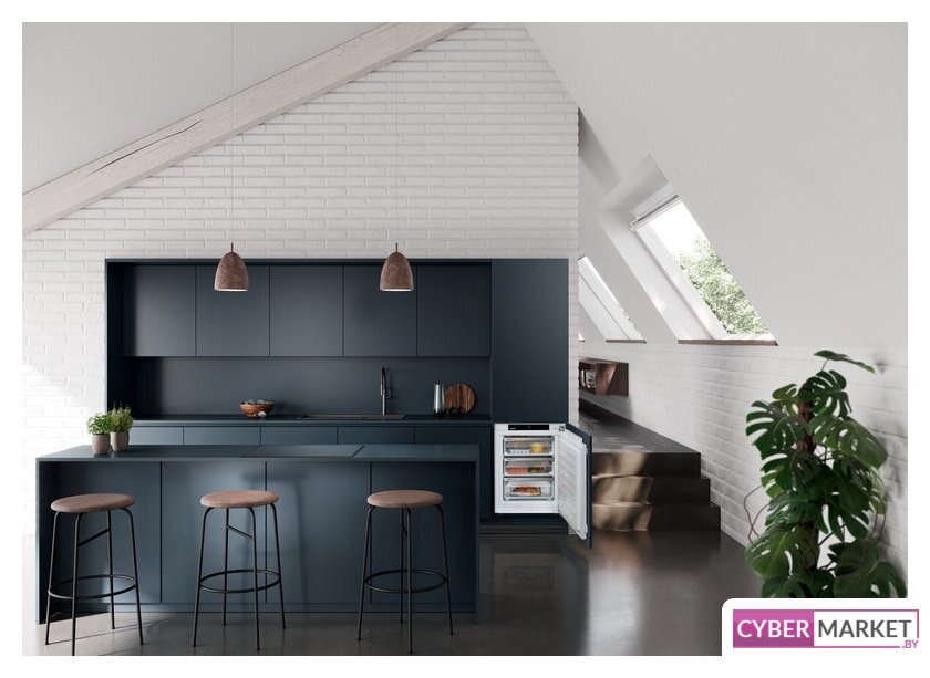 встраиваемый, полный No Frost, электронное управление, класс A+, полезный объём: 273 л (209 + 64 л), инверторный компрессор, зона свежести, перенавешиваемые двери, 54x55x193.5 см, серебристый