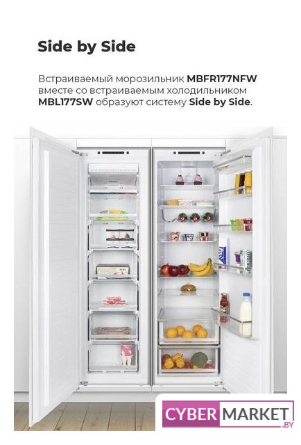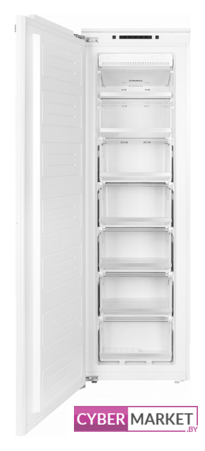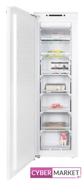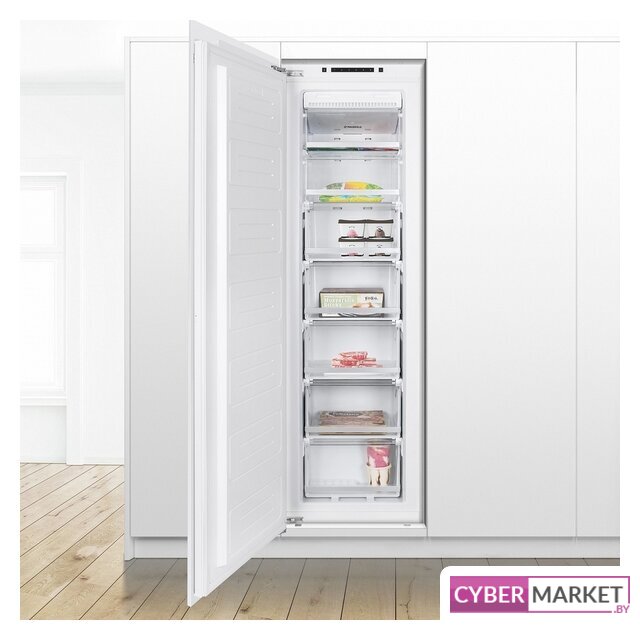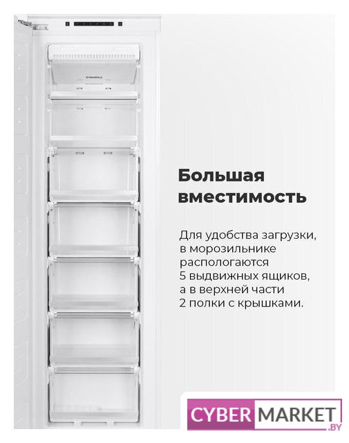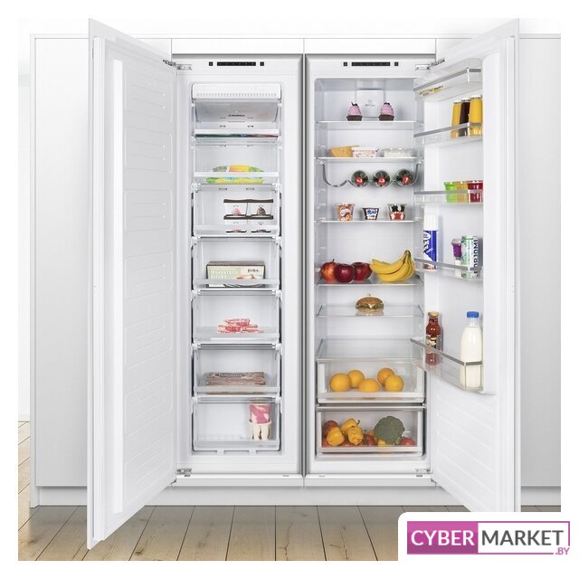 встраиваемый, скользящие направляющие, полный No Frost, электронное управление, полезный объём: 267 л (193 + 74 л), зона свежести, перенавешиваемые двери, 54x55x177.5 см, белый