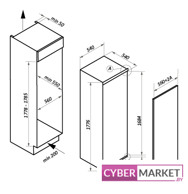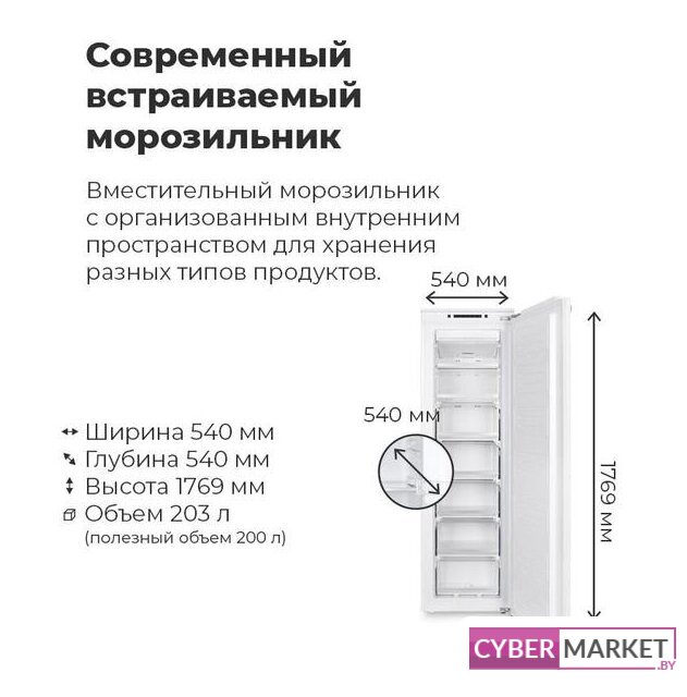 встраиваемый, полный No Frost, сенсорное управление, класс A++, полезный объём: 267 л (193 + 74 л), инверторный компрессор, зона свежести, перенавешиваемые двери, полка для вина, лоток для яиц, 54x55x177.5 см, белый