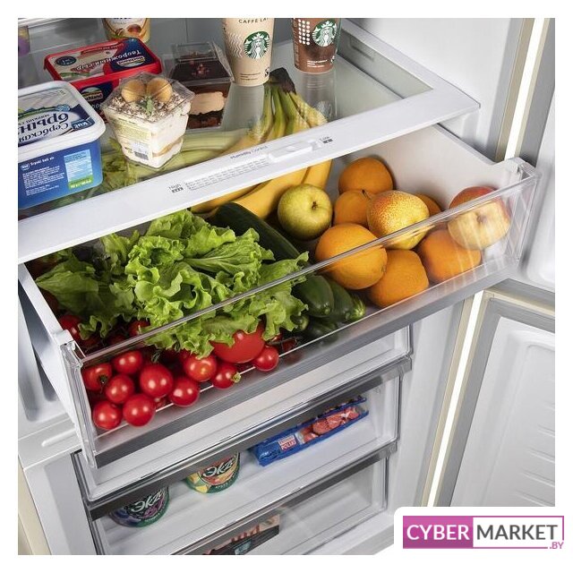 отдельностоящий, полный No Frost, электронное управление, полезный объём: 367 л (266 + 101 л), инверторный компрессор, зона свежести, перенавешиваемые двери, лоток для яиц, отделка: стекло, 59.5x66x201 см, белый
