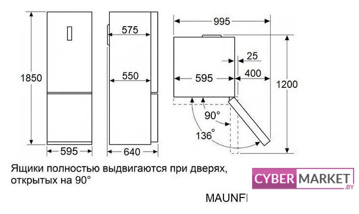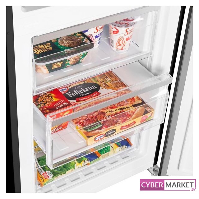 отдельностоящий, полный No Frost, электронное управление, класс A+, полезный объём: 496 л (331 + 165 л), лоток для яиц, 91.1x63.6x178 см, черный