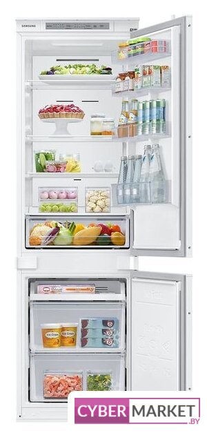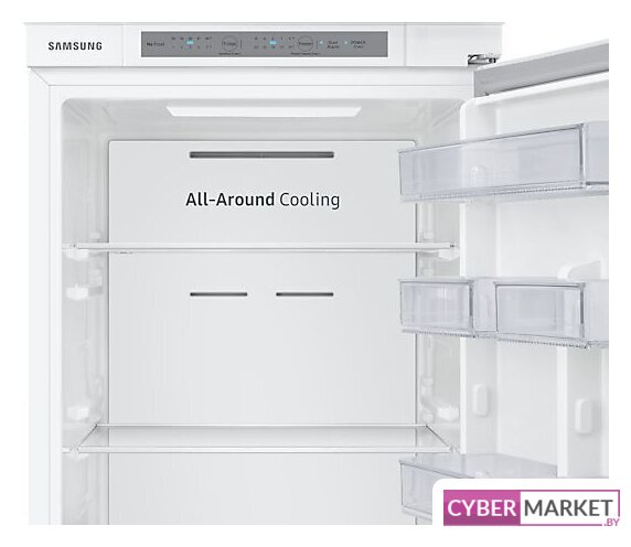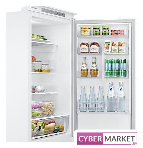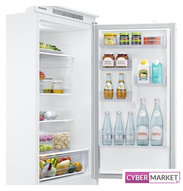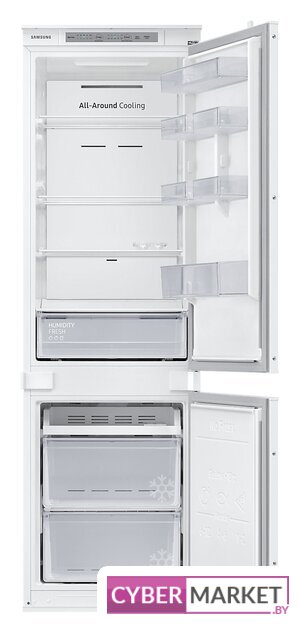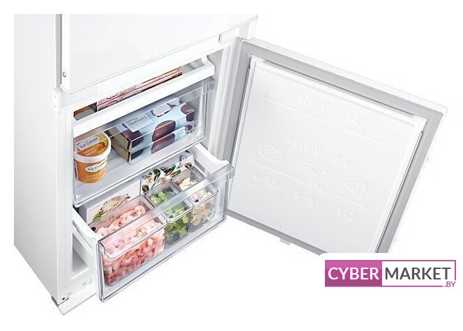 встраиваемый, скользящие направляющие, полный No Frost, электронное управление, полезный объём: 267 л (193 + 74 л), инверторный компрессор, зона свежести, перенавешиваемые двери, полка для вина, лоток для яиц, 54x55x177.5 см, белый