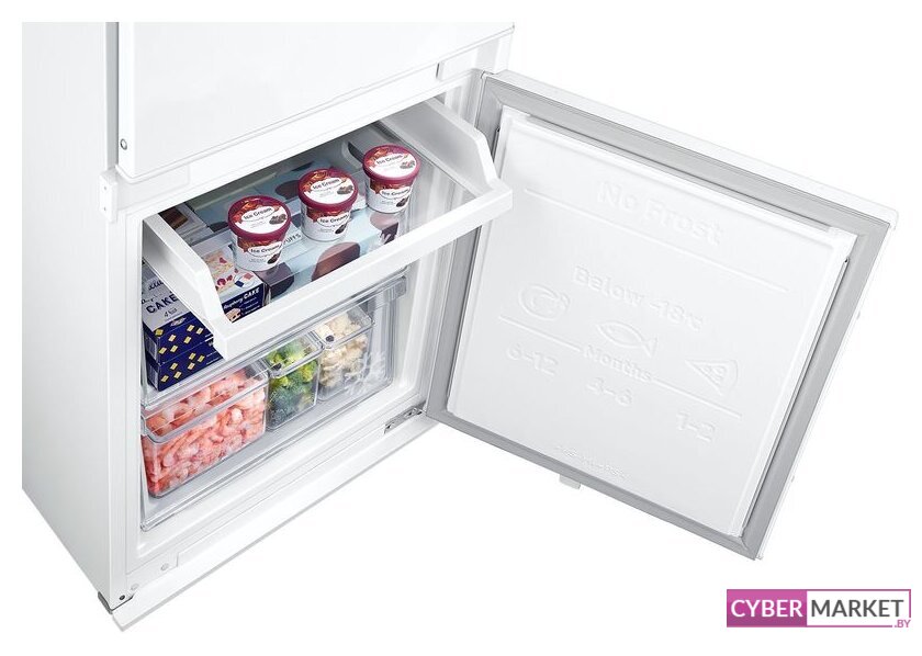 встраиваемый, скользящие направляющие, No Frost (морозильная камера), электронное управление, класс A+, полезный объём: 253 л (183 + 70 л), перенавешиваемые двери, лоток для яиц, 55.9x54.6x177 см, белый
