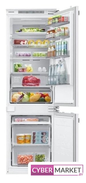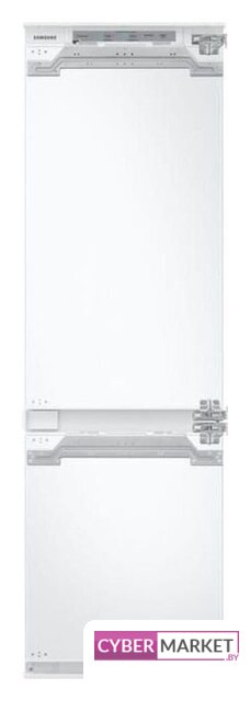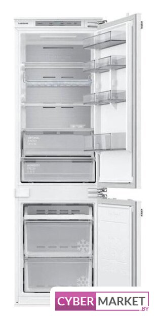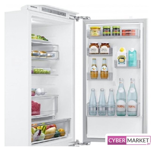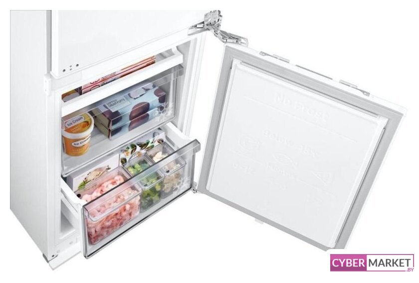встраиваемый, плоские шарниры, полный No Frost, сенсорное управление, полезный объём: 298 л (224 + 74 л), инверторный компрессор, зона свежести, перенавешиваемые двери, полка для вина, лоток для яиц, 54x55x193.5 см, белый