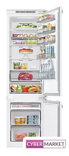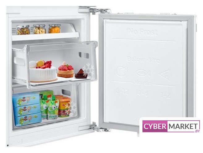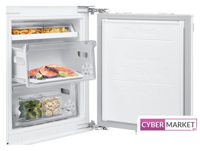 встраиваемый, скользящие направляющие, полный No Frost, электронное управление, полезный объём: 267 л (193 + 74 л), инверторный компрессор, зона свежести, перенавешиваемые двери, выдвижная полка, полка для вина, лоток для яиц, 54x55x177.5 см, белый