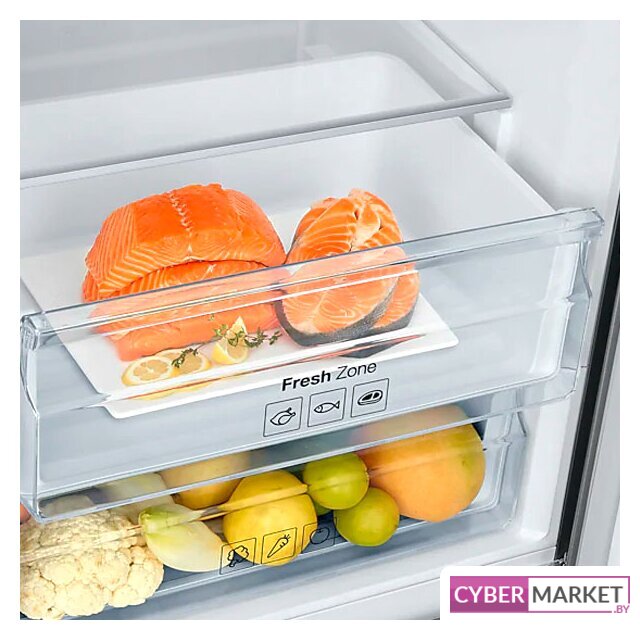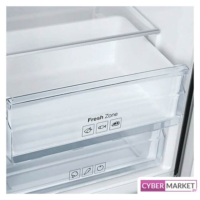 отдельностоящий, полный No Frost, электронное управление, класс A+, полезный объём: 367 л (269 + 98 л), инверторный компрессор, зона свежести, перенавешиваемые двери, лоток для яиц, 59.5x67.5x201 см, титан