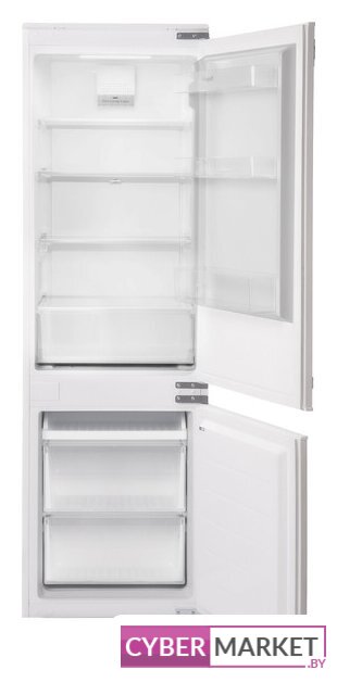 встраиваемый, скользящие направляющие, без No Frost, электронное управление, полезный объём: 268 л (196 + 72 л), перенавешиваемые двери, лоток для яиц, 54x54.9x177.9 см, белый