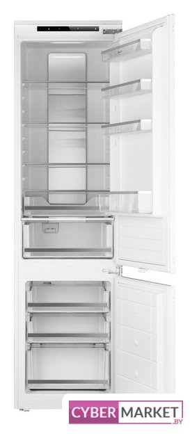 встраиваемый, скользящие направляющие, полный No Frost, электронное управление, полезный объём: 267 л (193 + 74 л), инверторный компрессор, зона свежести, перенавешиваемые двери, полка для вина, лоток для яиц, 54x55x177.5 см, белый