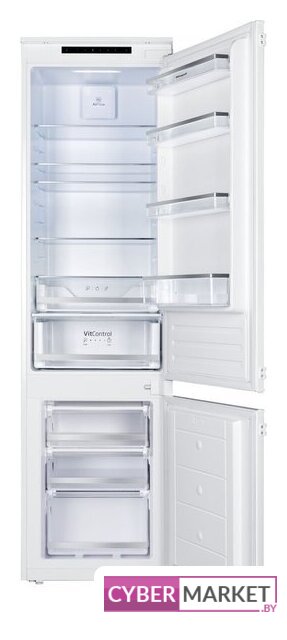 встраиваемый, скользящие направляющие, полный No Frost, электронное управление, полезный объём: 280 л (212 + 68 л), зона свежести, перенавешиваемые двери, лоток для яиц, 54x54.5x193.5 см, белый