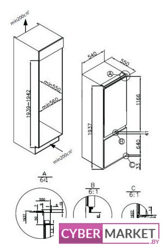 встраиваемый, полный No Frost, электронное управление, класс A+, полезный объём: 241 л (177 + 64 л), инверторный компрессор, перенавешиваемые двери, полка для вина, лоток для яиц, 54x55x176.9 см, белый