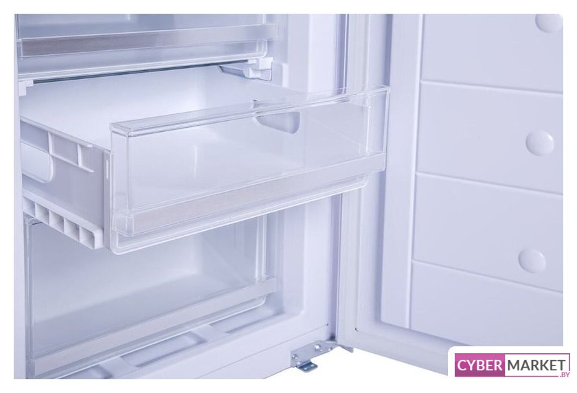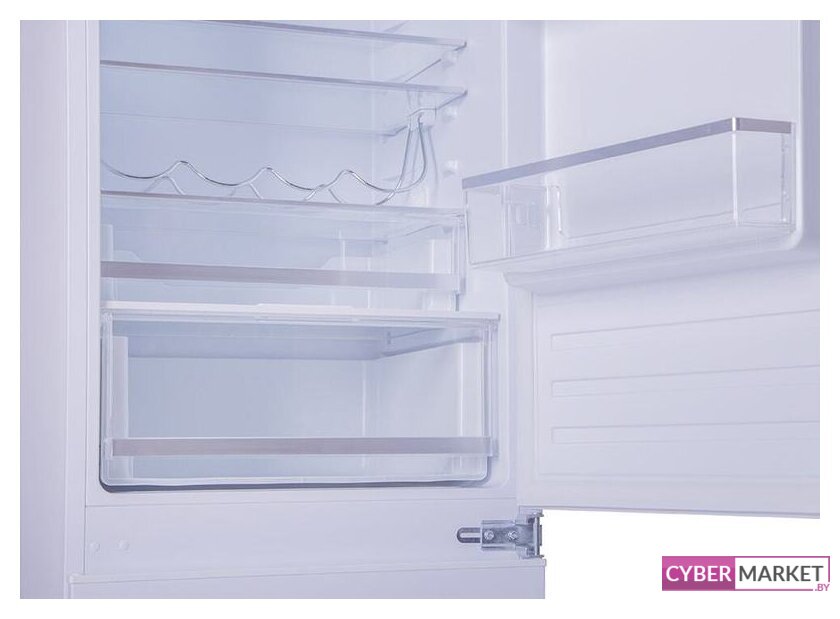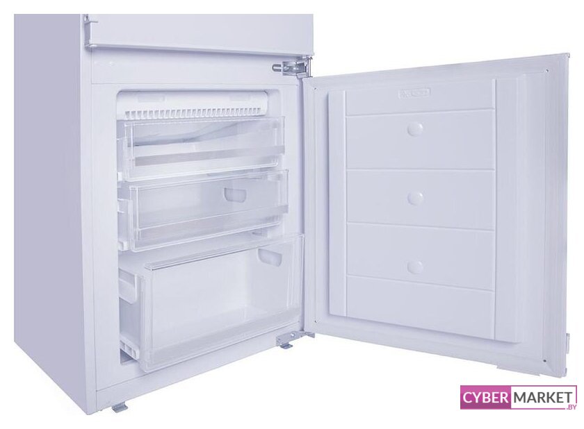 встраиваемый, без No Frost, электронное управление, класс A+, полезный объём: 270 л (195 + 75 л), инверторный компрессор, перенавешиваемые двери, лоток для яиц, 54x54.5x177.5 см, белый