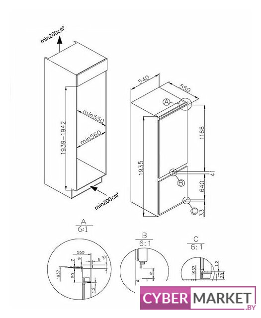 встраиваемый, жесткое, No Frost (морозильная камера), электронное управление, класс A+, полезный объём: 209 л, перенавешиваемые двери, 55.9x54.6x177 см, белый