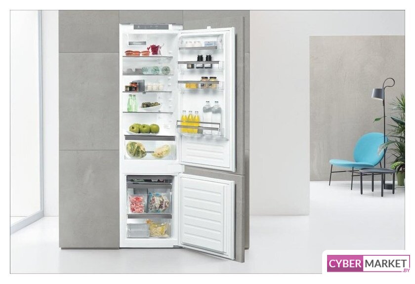 встраиваемый, полный No Frost, электронное управление, полезный объём: 267 л (193 + 74 л), инверторный компрессор, зона свежести, перенавешиваемые двери, полка для вина, 54x55x177.5 см, белый