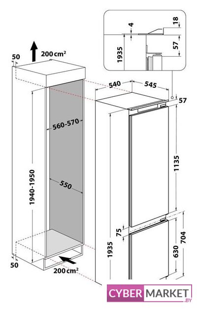 встраиваемый, плоские шарниры, полный No Frost, сенсорное управление, полезный объём: 298 л (224 + 74 л), инверторный компрессор, зона свежести, перенавешиваемые двери, полка для вина, лоток для яиц, 54x55x193.5 см, белый