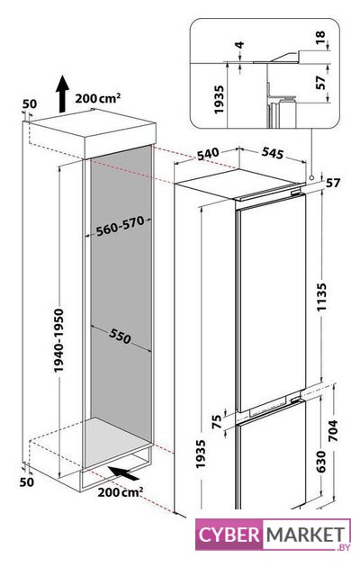 встраиваемый, без No Frost, электронное управление, класс A+, полезный объём: 293 л (225 + 75 л), перенавешиваемые двери, 54x55x193.7 см, белый