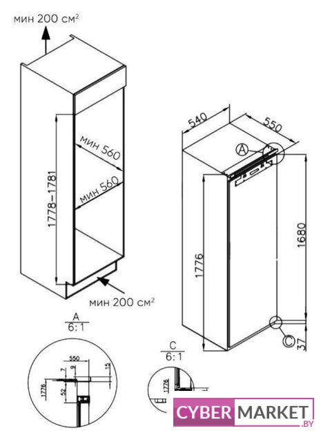 встраиваемый, жесткое, без No Frost, сенсорное управление, полезный объём: 264 л (183 + 81 л), перенавешиваемые двери, лоток для яиц, 55.9x54.6x177 см, белый